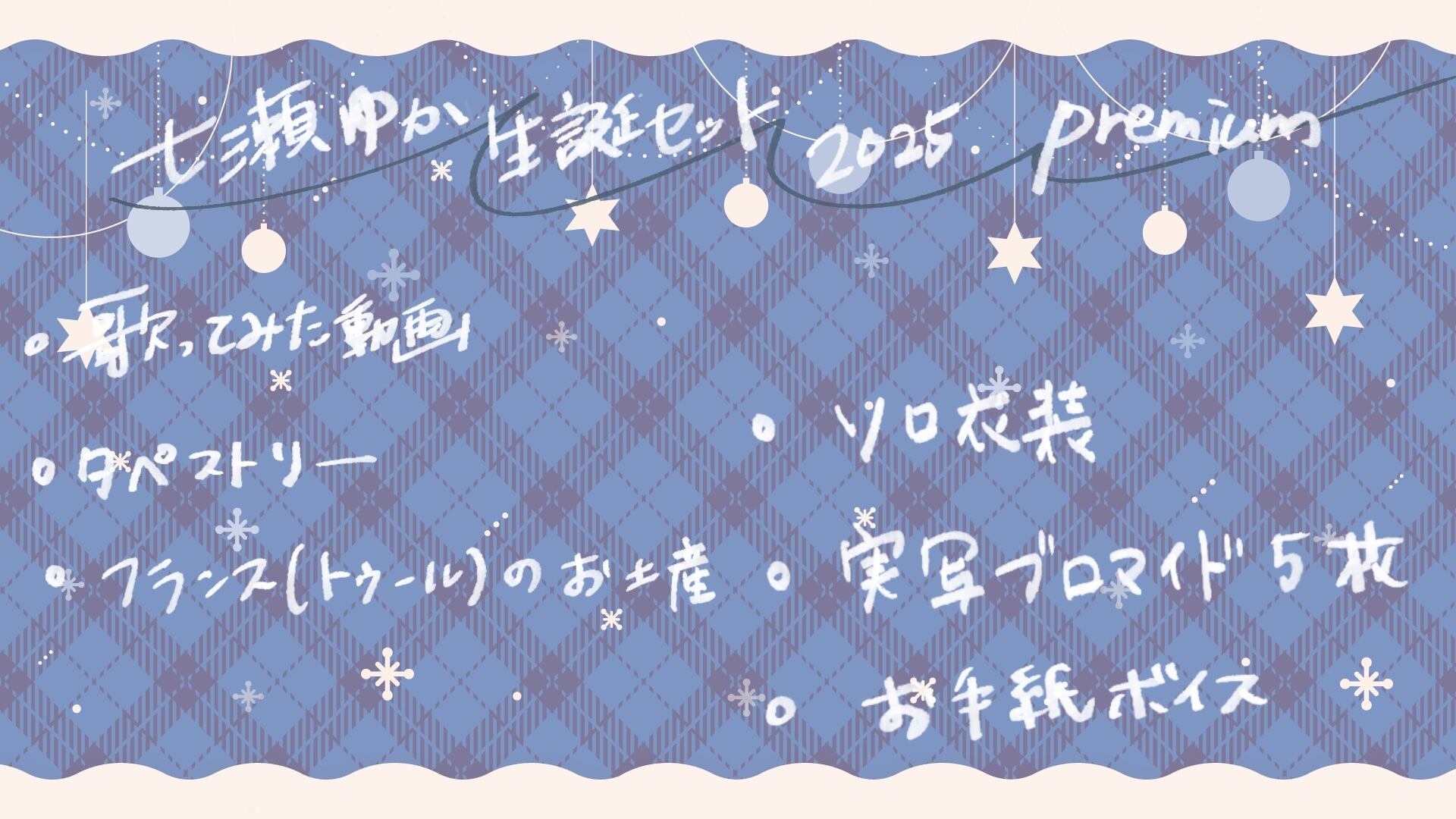 ・歌ってみた動画 ・タペストリー ・フランス(トゥール)のお土産 ・ソロ衣装 ・実写ブロマイド×5 ・お手紙ボイス